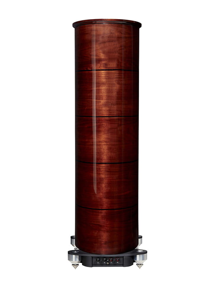 Obudowa kolumny wykonana została z najwyższej jakości naturalnego drewna orzechowego, wykończonego na wysoki połysk (Walnut High Gloss). Ręcznie dopracowane panele frontowe i górne tworzą wrażenie luksusu i solidności. Imponujący cokół nie tylko dodaje elegancji, ale także zwiększa stabilność i izolację od podłoża, wpływając pozytywnie na brzmienie.