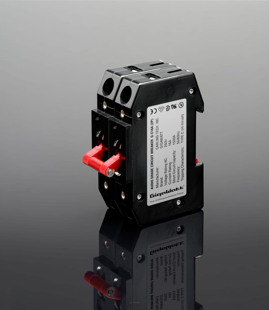 GigaWatt G-C16A 2P to 2-polowy, instalacyjny wyłącznik nadmiarowo-prądowy, przeznaczony do zabezpieczenia linii zasilających dedykowanych systemom audio-video klasy Hi-End.