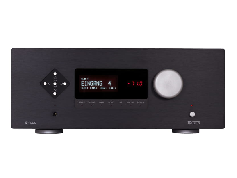 Epilog jest zbalansowanym wzmacniaczem zintegrowanym o konstrukcji dual mono. monofonicznej. Każdy z monofonicznych wzmacniaczy mocy zasilany jest przez potężny transformator 450 VA. Sekcja wejściowa Epilogu ma budowę modułową i może być wyposażona w maksymalnie sześć różnych modułów (obecnie: Line balanced, Line unbalanced, Phono, DAC) w dowolnej kombinacji na panelu tylnym. Dzięki temu może być konfigurowany elastycznie, wszechstronnie i przyszłościowo, zgodnie z indywidualnymi wymaganiami klienta. Wyświetlacz graficzny, który może być przyciemniany i wyłączany, prowadzi przez menu operacji, które jest w dużym stopniu intuicyjne. Różne opcje połączeń, ustawień i sterowania można wygodnie obsługiwać nie tylko za pomocą pilota systemu Trigon Director (w pełni aluminiowy srebrny), ale również za pomocą smartfonu, Talblet PC itp. w połączeniu z serwerem muzycznym Trigon Chronolog jako przyjaznym partnerem do odtwarzania Epilog.